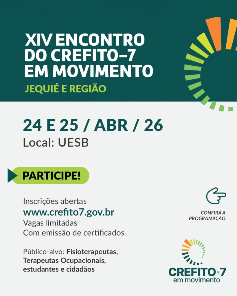 Alô, Jequié e região! Estamos chegando! Estão abertas as inscrições para o XIV Encontro do CREFITO-7 em Movimento, que vai acontecer nos dias 24/04 e 25/04, na Universidade Estadual do Sudoeste da Bahia (UESB), em Jequié. No dia 24/04, representantes do CREFITO-7 se reunirão com fisioterapeutas e terapeutas ocupacionais no Seminário 2 do Centro de […]