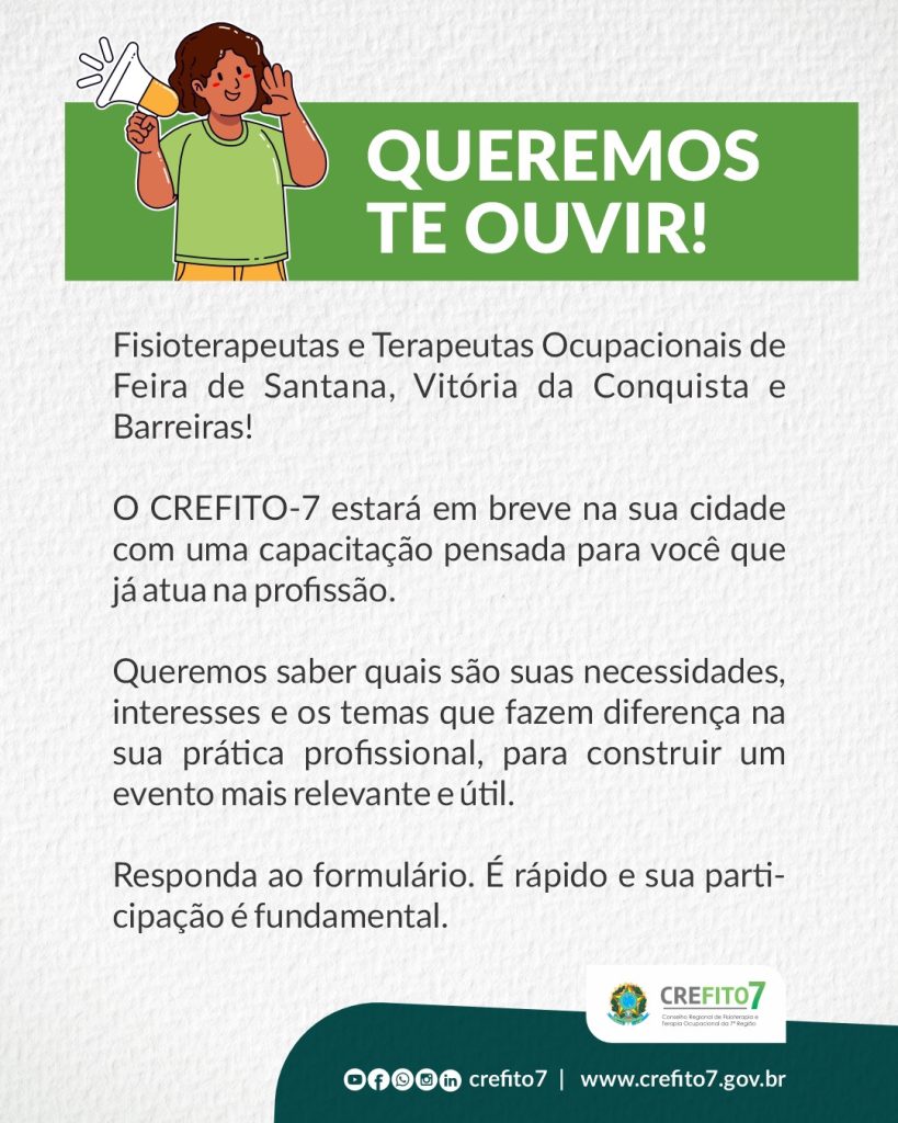 Fisioterapeutas e Terapeutas Ocupacionais de Feira de Santana, Vitória da Conquista e Barreiras! O CREFITO-7 estará em breve na sua cidade com uma capacitação pensada para você que já atua na profissão. Queremos saber quais são suas necessidades, interesses e os temas que fazem diferença na sua prática profissional, para construir um evento mais relevante […]