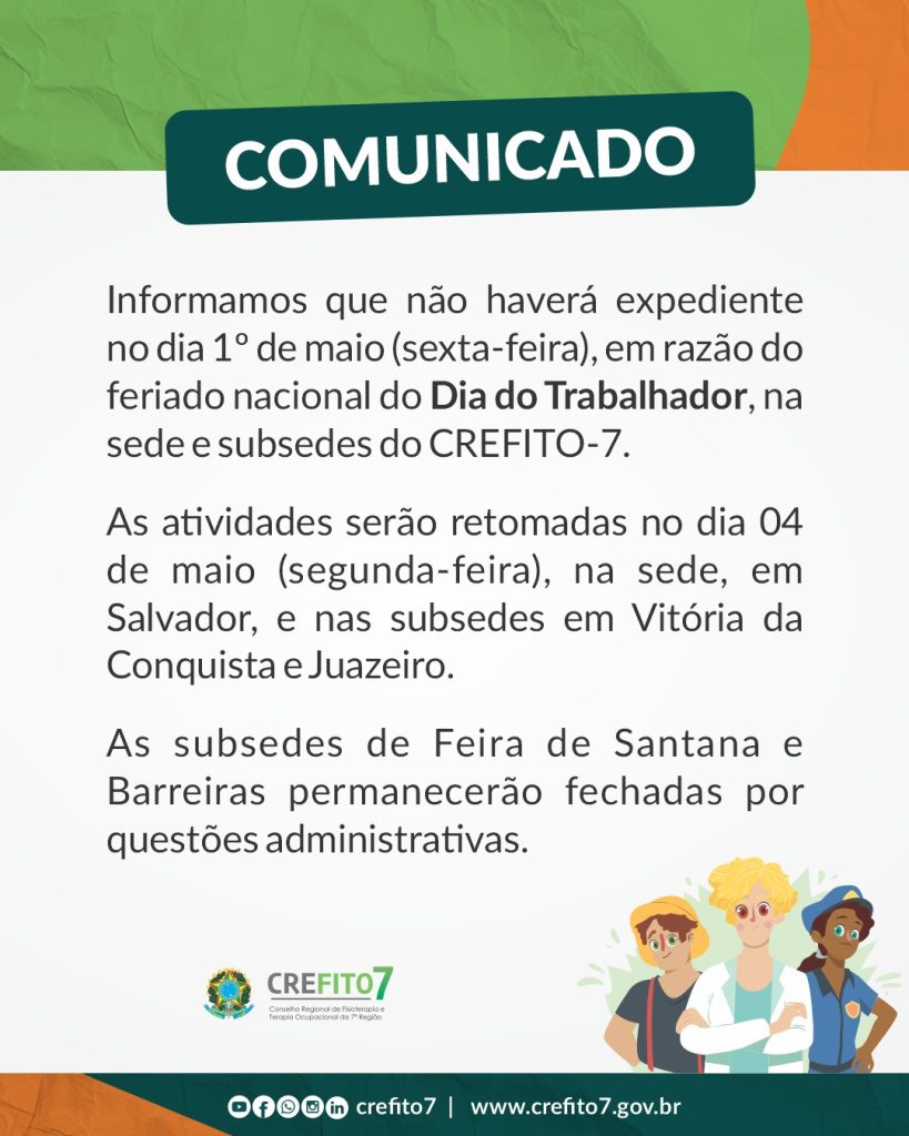 Informamos que não haverá expediente no dia 1º de maio (sexta-feira), em razão do feriado nacional do Dia do Trabalhador, na sede e subsedes do CREFITO-7. As atividades serão retomadas no dia 04 de maio (segunda-feira), na sede, em Salvador, e nas subsedes em Vitória da Conquista e Juazeiro. As subsedes de Feira de Santana […]
